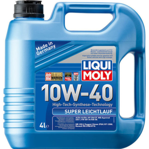 Λάδι κινητήρα Liqui Moly Super Leichtlauf 10W-40 4 L, υψηλής ποιότητας, συνθετικής τεχνολογίας, κατάλληλο για βενζινοκινητήρες και κινητήρες diesel, με ή χωρίς υπερπλήρωση (turbo).